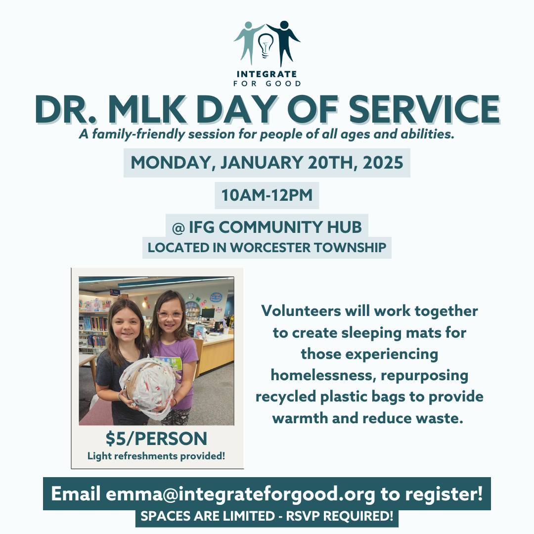 Let’s come together to make a difference! Join Integrate for Good for a day of volunteering on Monday, January 20th honoring the legacy of Dr. King. Come learn how to recycle plastic bags into sleeping mats for our neighbors experiencing street homelessness, while building an inclusive community!