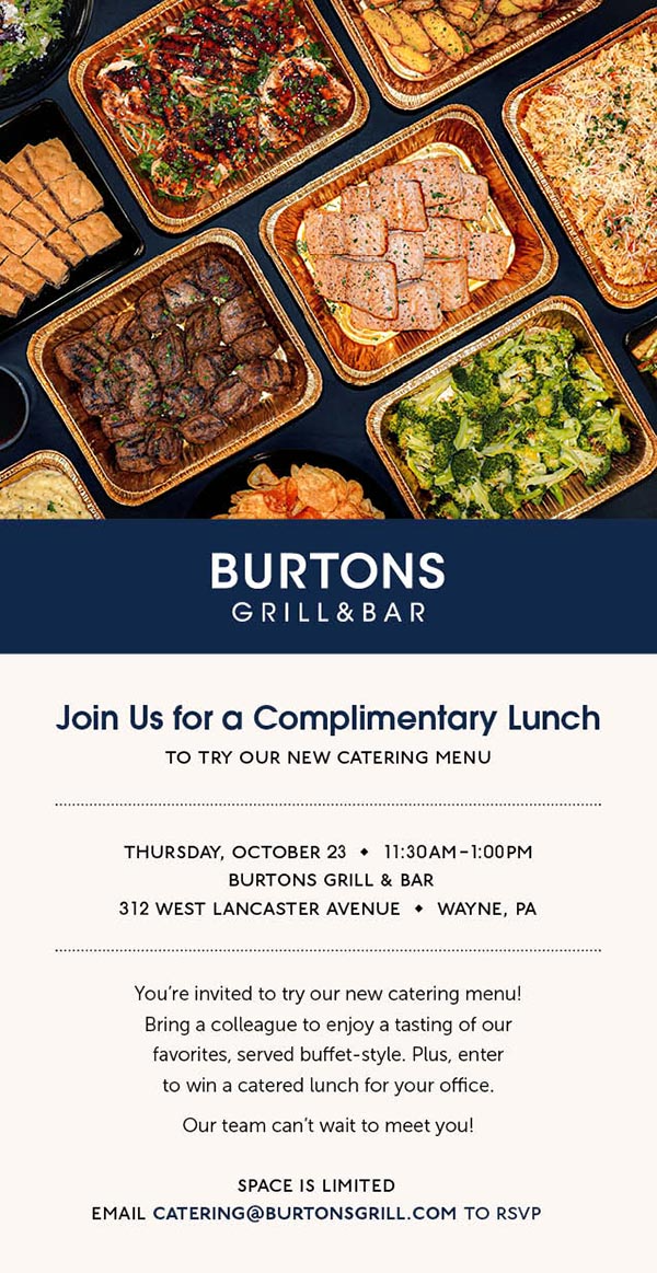 Try Burtons Grill & Bar's New Catering Menu on Oct. 23Attendees can enter to win a catered lunch for their office.